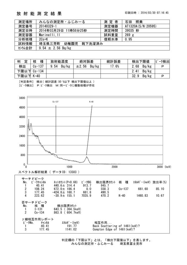 「埼玉県三芳町 幼稚園児 靴下洗濯済み」39035秒測定。検体重量、269g。セシウム合計、9.54±2.56Bq/Kg検出。検出下限値、Cs134、2.41Bq/Kg。Cs137、2.68Bq/Kg pic.twitter.com/Rn5wfyrC5O