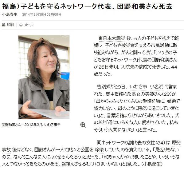 福島?子どもを守るネットワーク代表、団野和美さん死去(享年44歳)