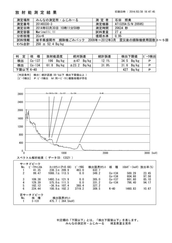 「岩手県盛岡市 掃除機ごみパック 2009年~2012年3月 震災後の掃除機使用回数3~5回」20634秒測定。検体重量、27g。セシウム合計、258±52.4Bq/Kg検出。検出下限値、Cs134、31.6Bq/Kg。Cs137、3 pic.twitter.com/p4ZsfUIF4z