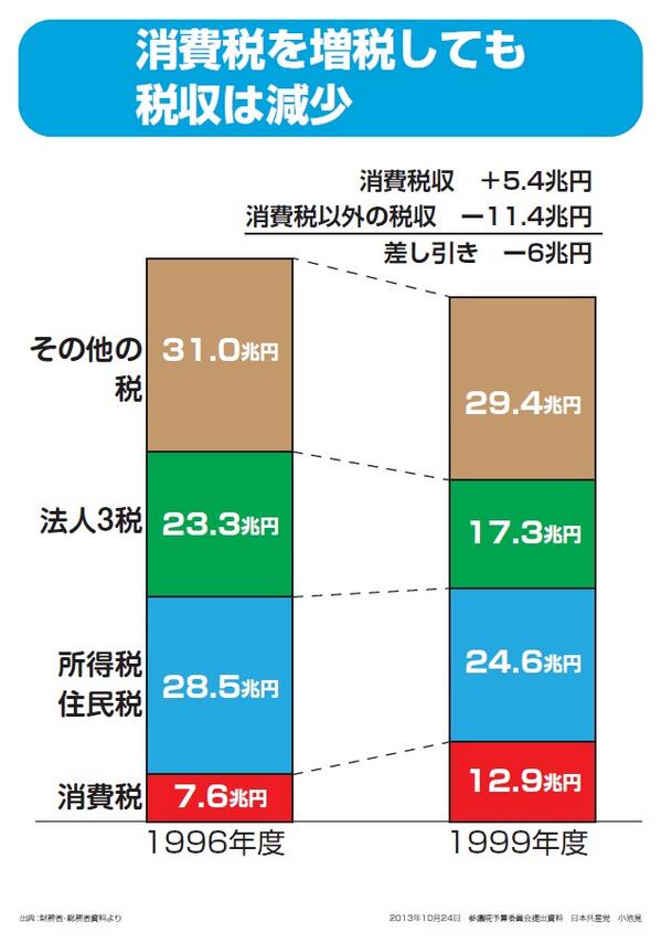 法人税が下がってる!“@pokenshishoo: 消費税を3%から5%に上げたとき(1997年)、税収はむしろ減ってしまったのじゃ。