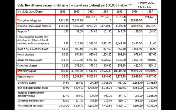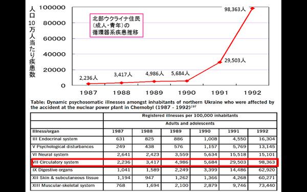 よく言われることだが、北部ウクライナ住民が最も多く罹患している病気は循環器系疾患である。事故後4年を過ぎて急増し、1992年には10万人対98,363人が罹患している。ほぼ100%の住民が循環器系に何らかの障害を持っていることになる。 pic.twitter.com/IwKNihdvpd