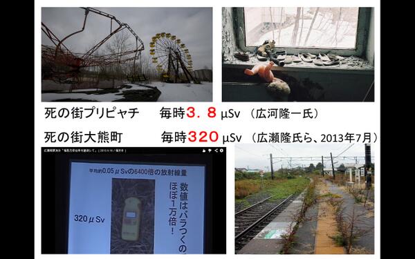現在、市の街プリピャチは平均毎時3.8μSv。死の街大熊町では320μSv/h(2年間で7Sv)という致死量の線量が記録されている。これ一つ見ても、福島の住民(とくに避難民)の被曝量がチェルノブイリより少ないという見解には説得力がない pic.twitter.com/evL6gQclo8