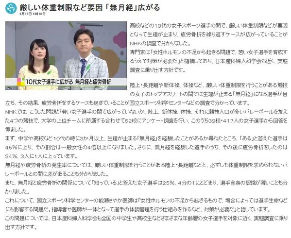 厳しい体重制限など要因 「無月経」広がる