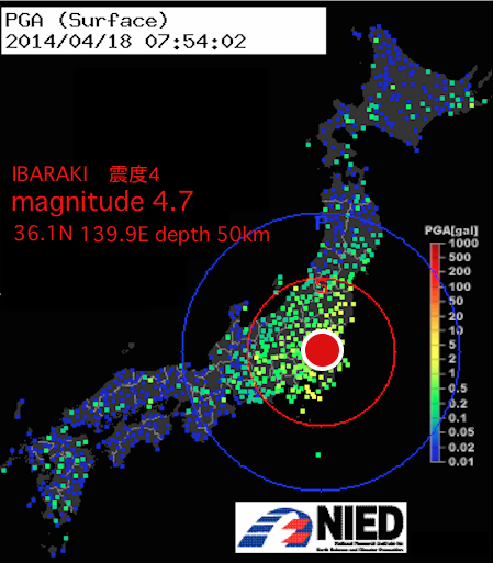 4月18日 7時53分:茨城南部 magnitude 4.7 (typhoon.yahoo.co.jp/weather/jp/ear…) 静岡まで揺らす直下型地震。 この震源は2013年11月10日に(震度5)の地震があった震源域。この時は青森まで揺らしてます pic.twitter.com/9C3FKT0LvQ