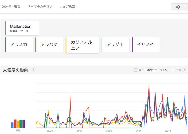 googleトレンド検索 Malfunction(動作不良、機能不全、不具合)地域は アラスカ アラバマ カリフォルニア アリゾナ イリノイ