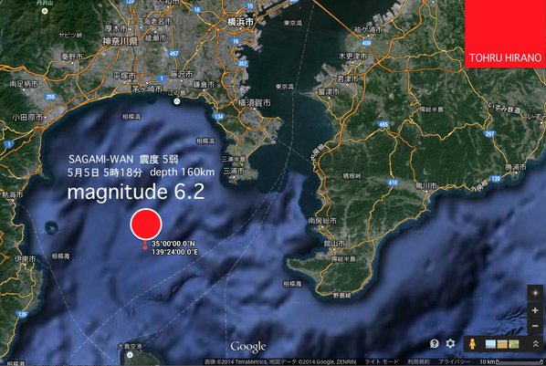 5月5日 5時18分 相模湾(magnitude6.2 depth 160km 震度5:typhoon.yahoo.co.jp/weather/jp/ear…) 震源が浅いと、更に大きな揺れになるので、余震には注意した方がいいです。 pic.twitter.com/lGxI9tM42U