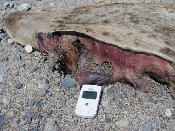 数千Bqの線源に、機種が違う十数台のガイガーカウンターを近づけても無反応だった。大学から貸与されたアロカも。 このアシカの周辺環境が 0.15μSv/h だとしても、臓器の部分には数万ベクレルはあるだろう。人間でも高濃度に汚染されるとGMで反応する。サミ族でそれは実際にあった。