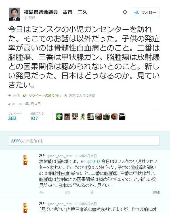 んだコイツ…。大したタマモノだね。モルモット扱い。RT @onodekita おそらく消されるだろうから、残しておく。福島県議の小児の脳腫瘍、白血病がどうなるか、「見ていきたい」発言twitter.com/f393/status/22… … pic.twitter.com/AYgrAMSo43"