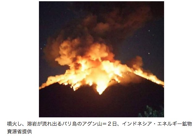 バリ島のアグン山(標高:約3000メートル)の噴火で溶岩が半径2キロにわたって流出。数日前にも大きな噴火してて、今回のは、更に大きな噴火。
