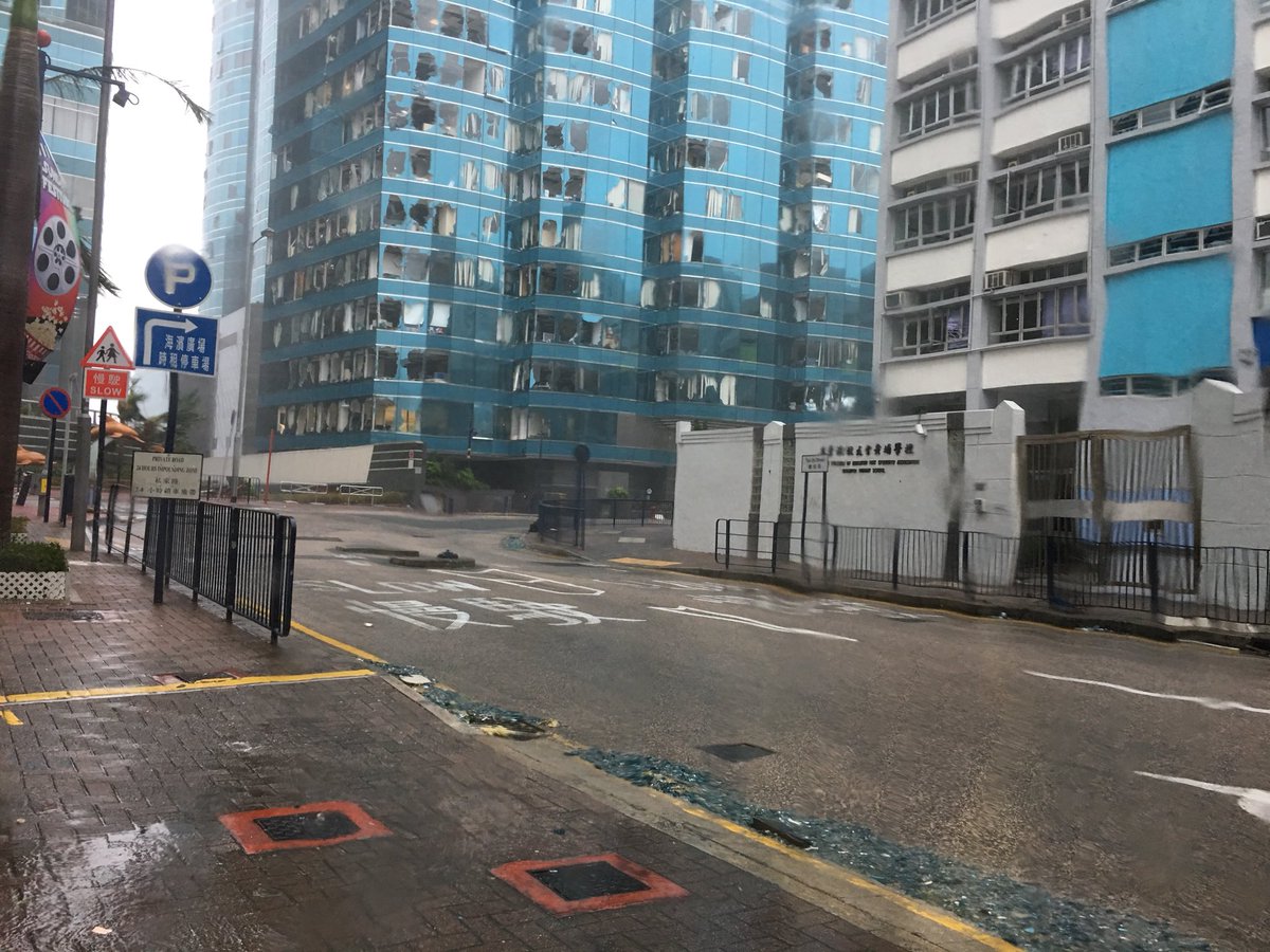 Just took these in Hung Hom waterfront in Hong Kong . Windows broken and shredded glasses everywhere. At a point I can I heard shredded glasses/ or something else hitting the car @SCMPNews #mangkhut https://pic.twitter.com/wqwHRMs5rB