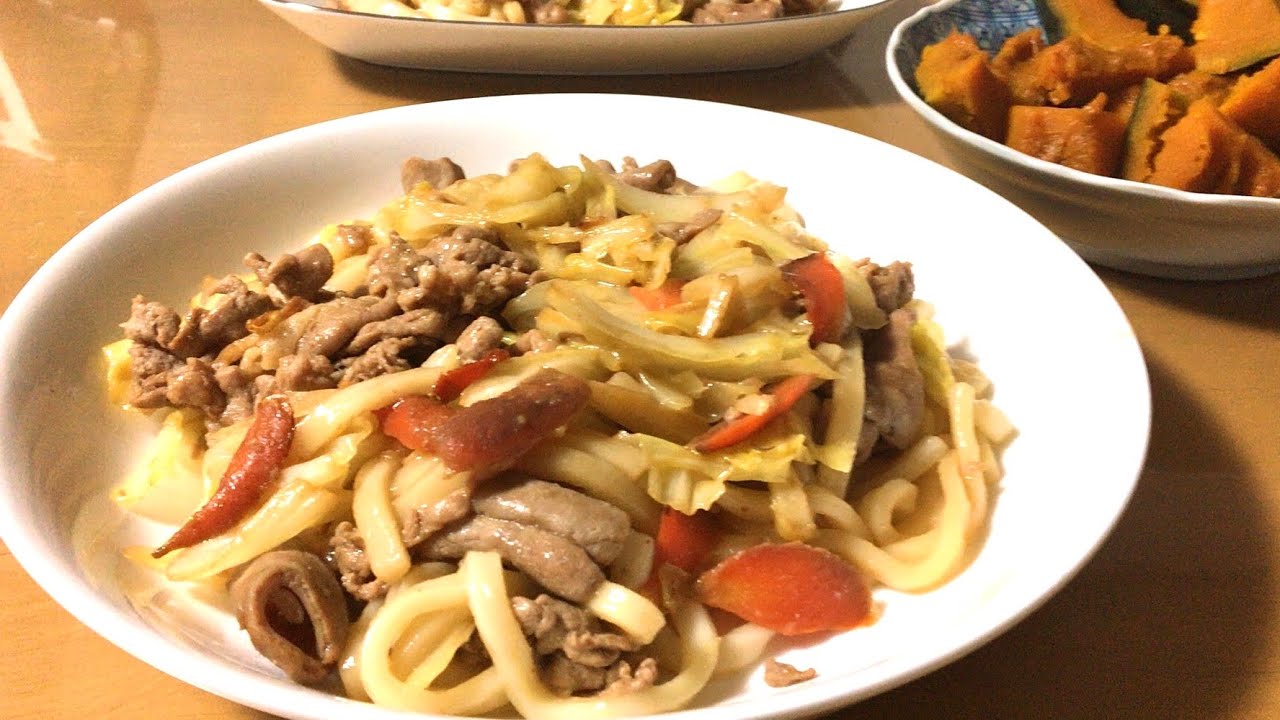 鶏ちゃんの素で豚ホルモンと豚小間の焼きうどんを作ってみました。