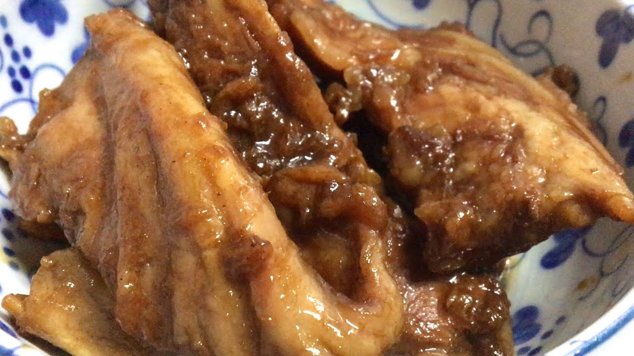 豚軟骨を下茹でして灰汁と余分な油を落としてから生姜、ニンニク、ネギで臭みを取りながら煮込み、湯が半分くらいまで減ったところで酒 (今回は泡盛を使用) 、てんさい糖、醤油で味付けします。