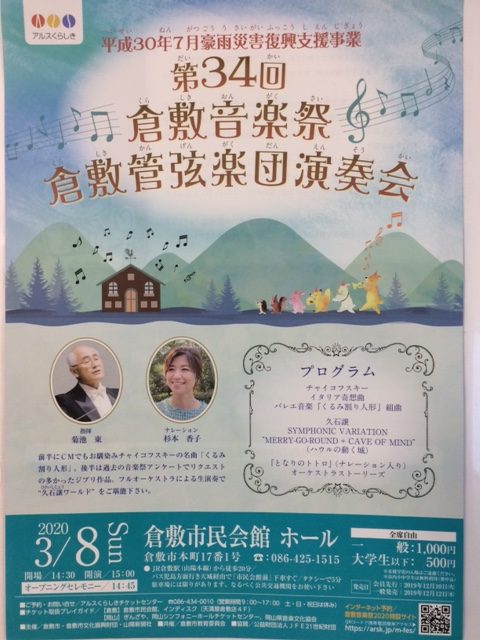 倉敷管弦楽団では、ジブリ音楽を中心にくるみ割り人形やイタリア奇想曲をお届けします。
