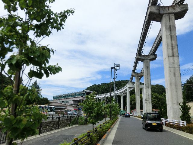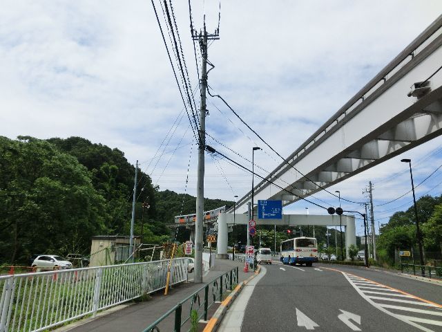 モノレールは左にカーブしてトンネルに入りますがトンネル内は道路と平行してます。