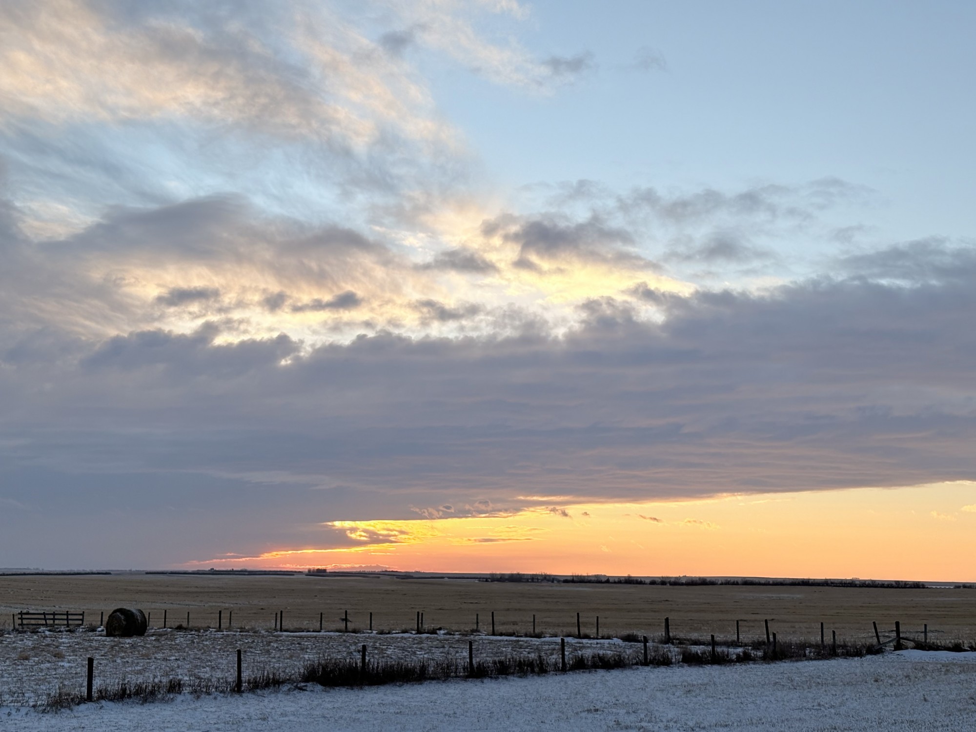 地平線しか見えないカナダ・アルバータ州大平原の朝。