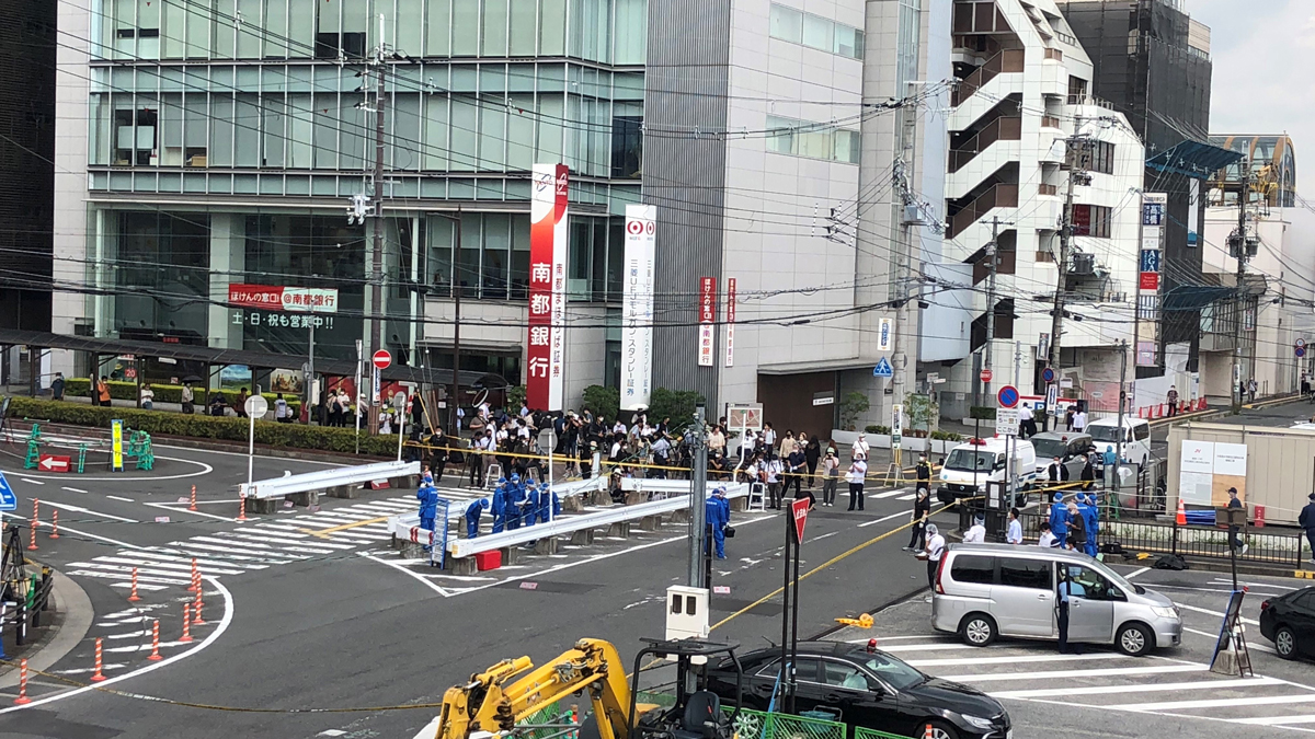 安倍氏の背後は人もまばらで通行止めもされてないため車も行きかうため手薄。