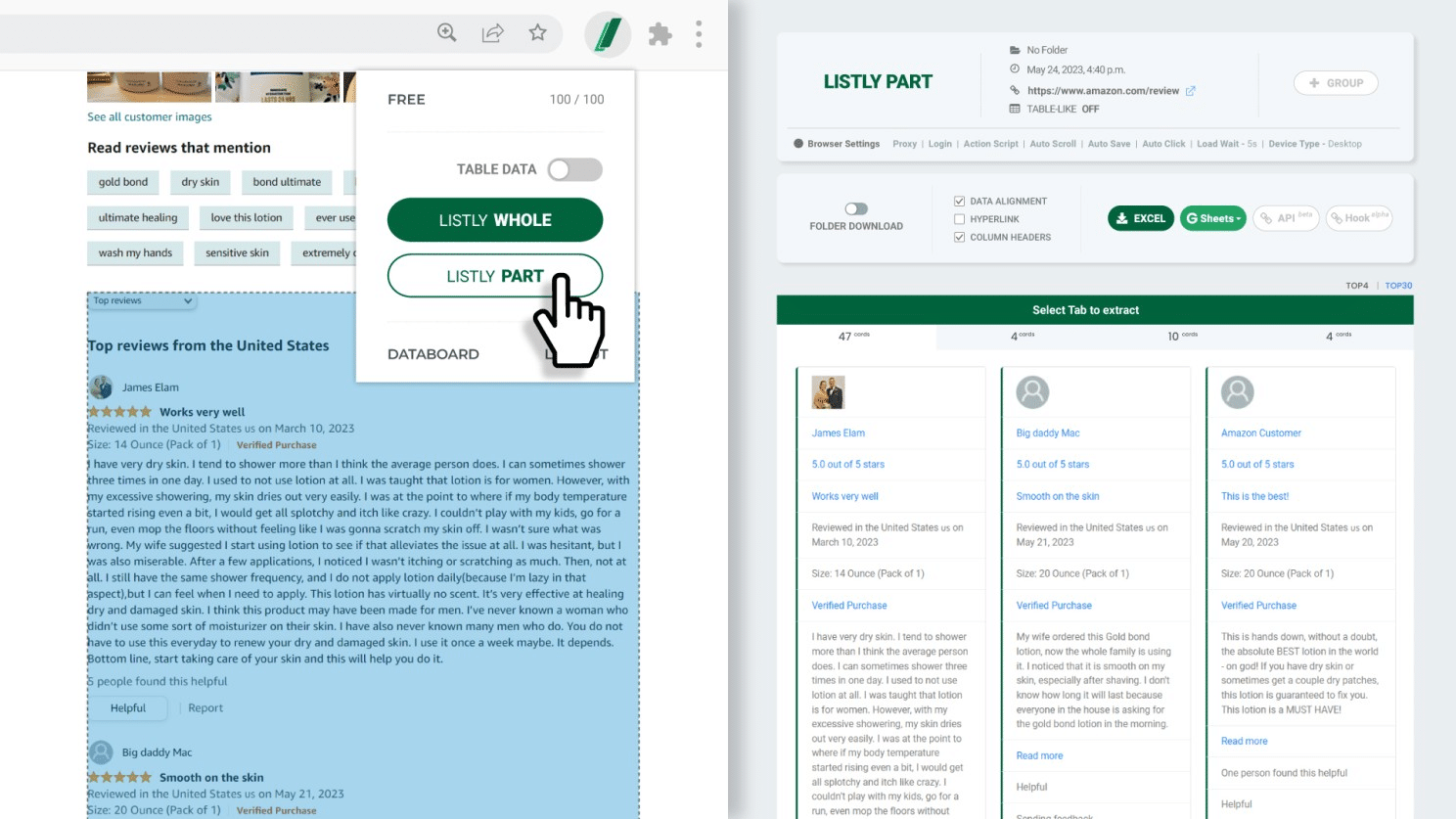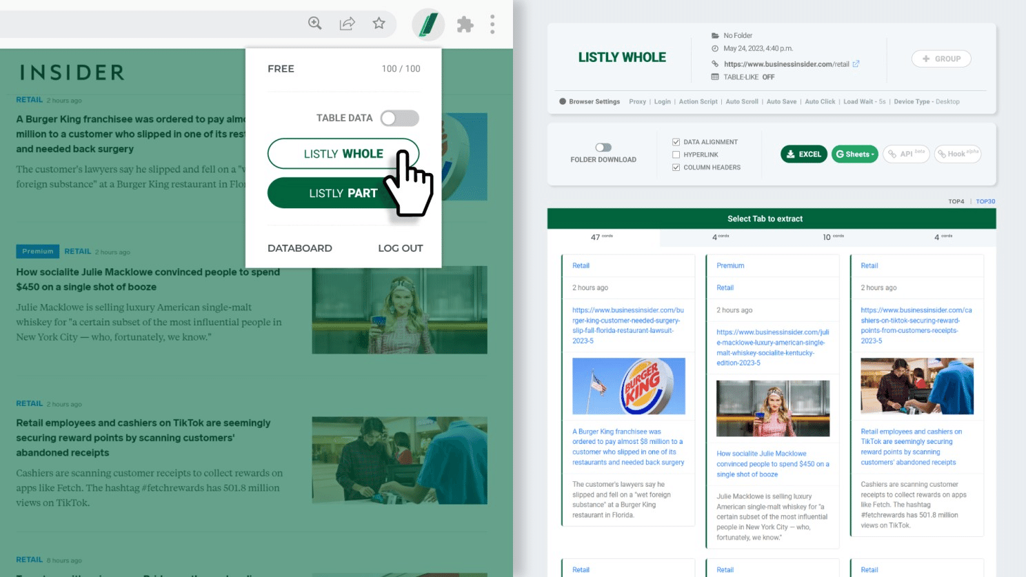 ただし、ウェブスクレイピングには、Python、Java、C++など、多くのプログラミング言語の使用が必要です。ウェブサイトからデータを抽出するためには、これらの言語が必要となります。一方、Listlyは、プログラミングを一切必要とせず、マウスをクリックするだけで公開ウェブサイトから大量のデータを即座に取得できるウェブスクレイパーブラウザ拡張機能です。すべての情報が収集された後、さらなる分析のためにMicrosoft ExcelまたはGoogle Sheetsを使用してスプレッドシートにインポートされます。