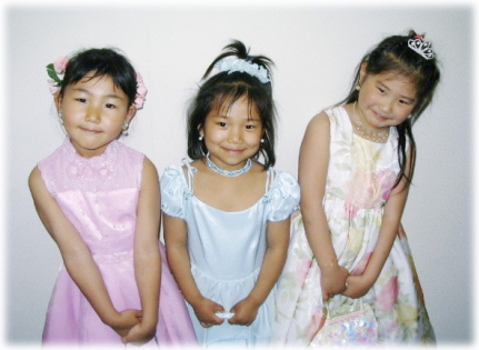 なかなか可愛く仕 上がりました。(^0^)小学校1年生のみさきちゃん・めいちゃん・よしかちゃん。プリキュアの映画を見に行った帰りです。最初は恥ずかしがっていましたが、慣れてくるとノリノリでドレスを着てくれました。