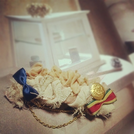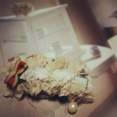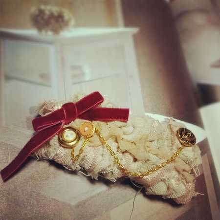 切りっぱなしの生成りの布、レースや紅茶染めしたシフォンぽい生地などを土台に使っています!