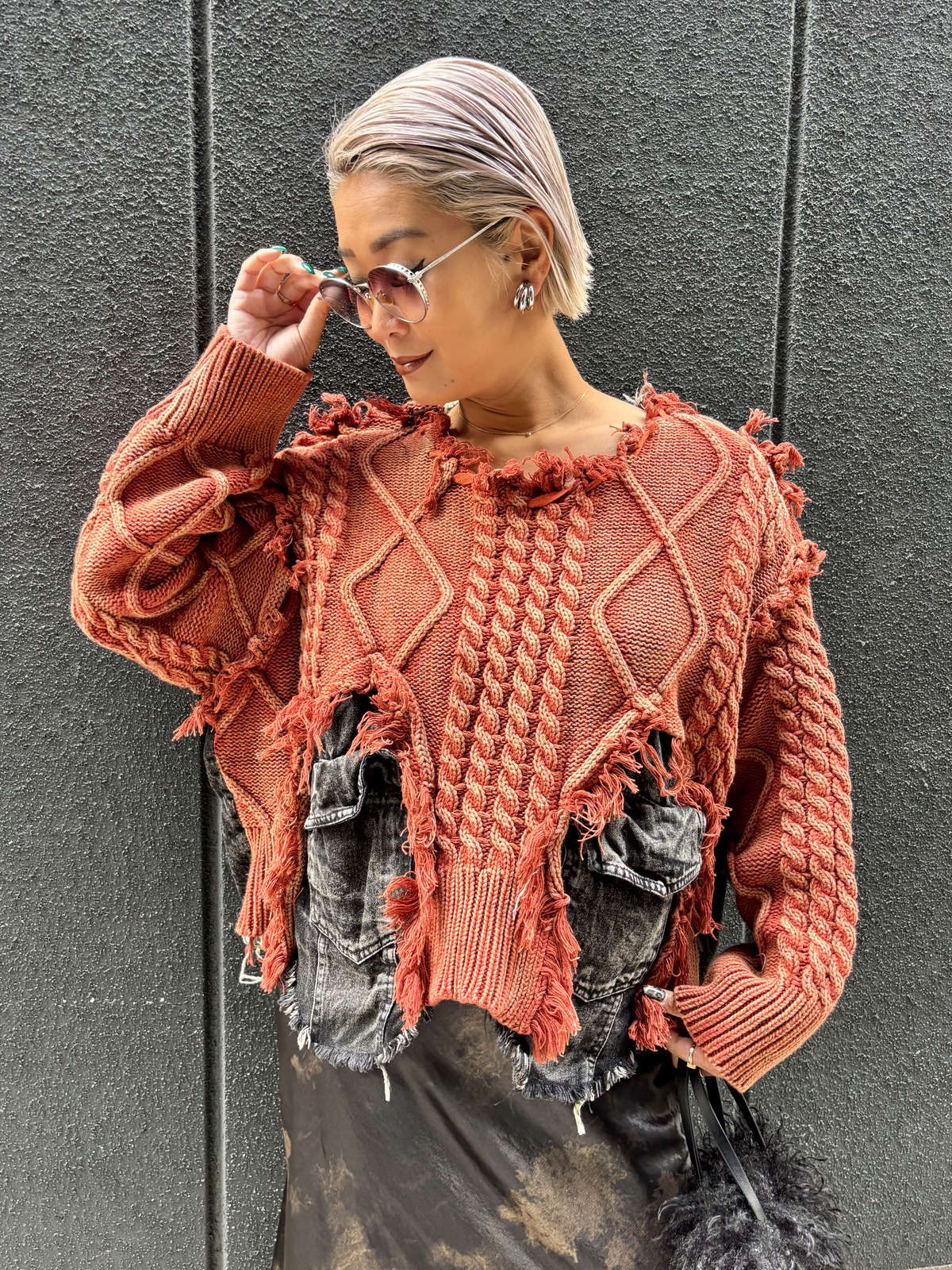 トップスのニットは、お尻が隠れるくらいの