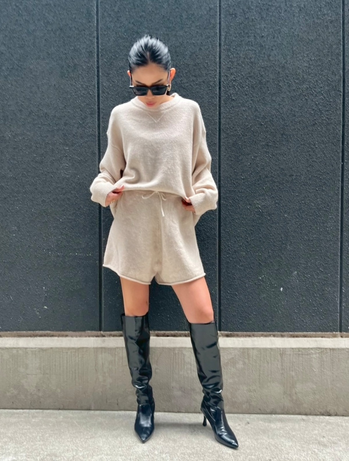 ニット×ショートパンツのセットアップで