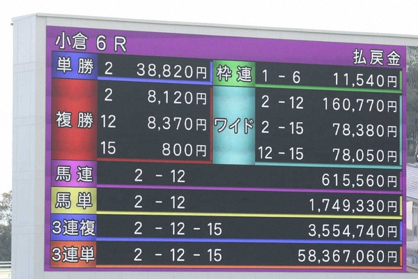 小倉6RでJRA史上最高配当! 3連単5836万円 的中は1票のみ 馬単、馬連、ワイドも記録更新(スポーツニッポン) 31日の小倉6R(3歳未勝利、若手騎手限定、芝1200メートル)で18頭立て最低人気(単勝388.2倍)のカシノリアーナ(牝=天間、父サトノクラウン)が優勝し、2着にもこの日が初出走でブービー17u.lin.ee