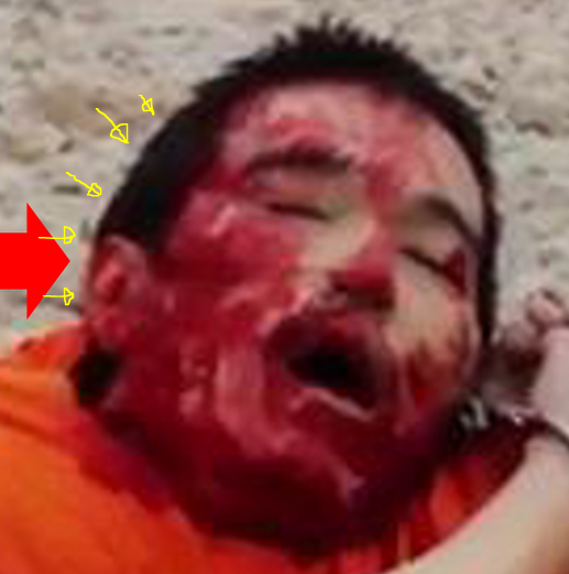 英文のサイトだが、こちらのサイトには、後藤健二の首切りビデオが載っている。このビデオをよ~く見てもらいたい。特に、首切りのシーンでは、1コマ、1コマ、ビデオをクリックして止めて、ナイフの動きと、それに伴う出てくるべき血が出血するかどうかを観察してもらいたい。このビデオではナイフが後藤の首を2スライスするのが映っている。3スライス目は画面が真っ黒になってしまい見れない。しかし、2スライスで出血を伴っていないのが分かれば、それで首切りは嘘だったと証明するには十分だろう。つまり、以前の首切り劇と同様、ナイフはプラスチックのオモチャのナイフだったという事だ。