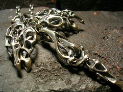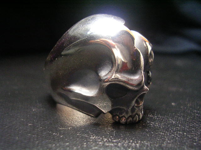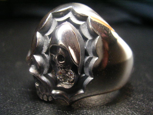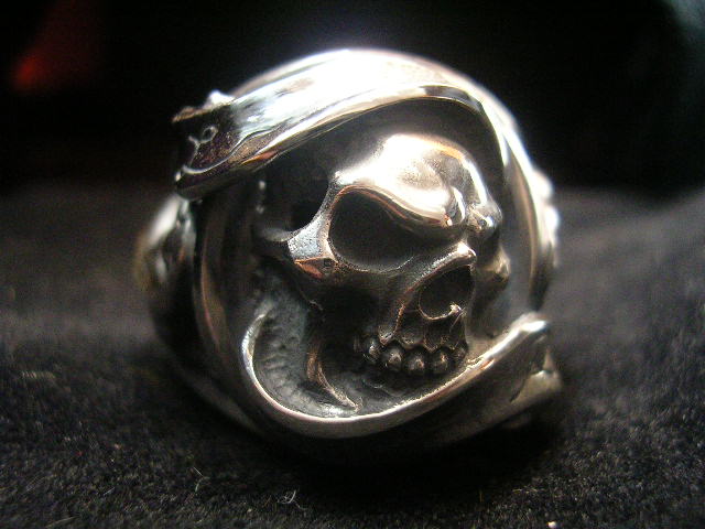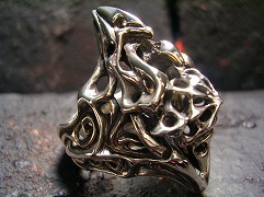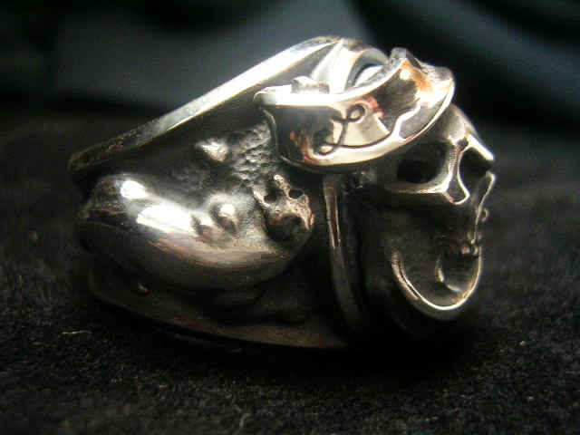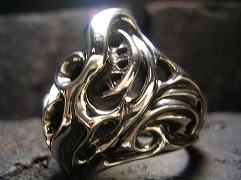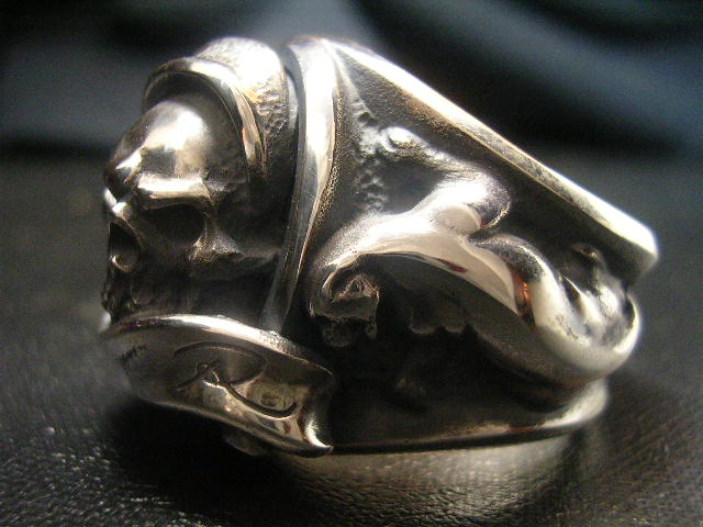 こちらはリボンが額の様になり、パンサーのトラディショナルな雰囲気が芸術的なリングに仕上がっております。デザイナー2人の息がピッタリ合い、コラボと言うより完成された1つのアイテムかのような傑作品。このアイテムはベースをLIQUID、中心のリボン&スカルをRATRACEが製作しております。中抜きがされていないのでズシリと感じる重量感も魅力の一つではないでしょうか。