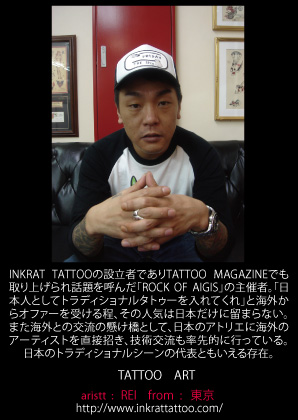 INKRAT TATTOOのREI氏。今回GROUP SHOWを開催するにあたりSEYA経由でフライヤーデザインをお願い致しました。