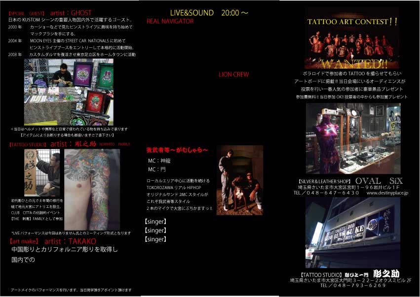 お師匠さんである彫りひと氏は皆さん大好きなCROWSの作者でもある高橋さんが名詞などを手がけたりしている。他にもCLUBチッタd伝説とも言えるイベント「THE刺青」などもプロデュースする存在勿論。彫之助氏も会場でLIVE パフォーマンスをしたファミリーの一員。当日はLIVEは行わないが氏の力強い作品を目でみて感じてほしいっ!!