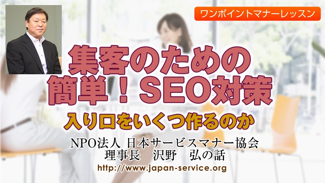 日本サービスマナー協会youtube動画「集客のための簡単!SEO対策・入り口をいくつ作るのか-日本サービスマナー協会理事長 沢野弘」です。