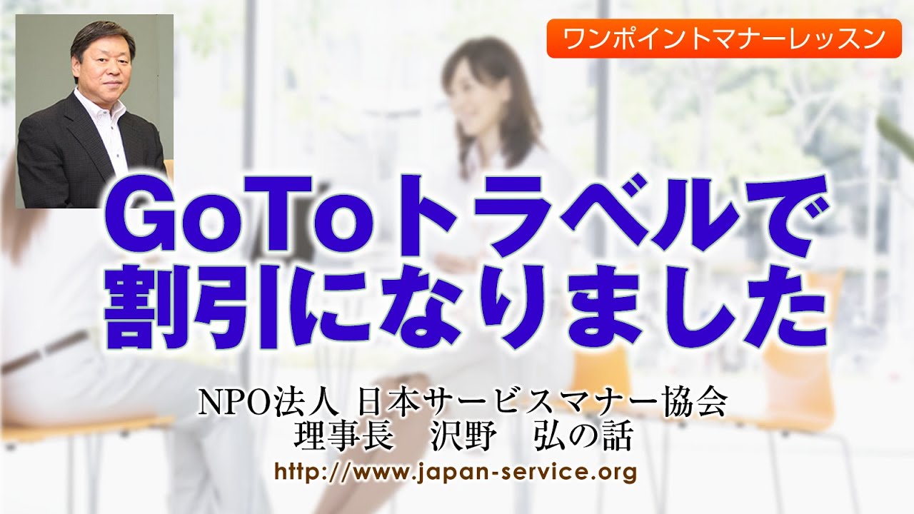 日本サービスマナー協会youtube動画「GoToトラベルで割引になりました-日本サービスマナー協会理事長 沢野弘」