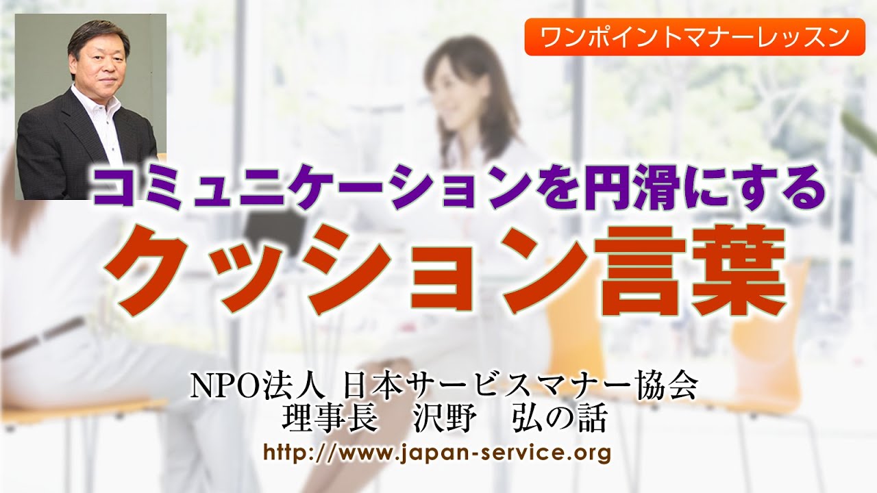 コミュニケーションを円滑にするクッション言葉-日本サービスマナー協会理事長 沢野弘日本サービスマナー協会youtube動画「コミュニケーションを円滑にするクッション言葉-日本サービスマナー協会理事長 沢野弘」みなさんはクッション言葉というのはおわかりでしょうか。おそれいりますが、申し訳ありませんが、失礼ですが、差し支えなければ、お手数ですが、など様々な状況で相手の人への伝わり方を和らげる言葉を...youtu.be