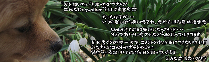 ブログ再開しました ♪ PCが直ったのでブログ再開しました ♪ 見に来てやって下さいね (^^) ブログ [ Dogwalker ] 愛犬ルナとの毎日は ここをポチっと Click Here! 『Dogwalker』 http://dog.pelogoo.com/lunapapa/ Click Here!