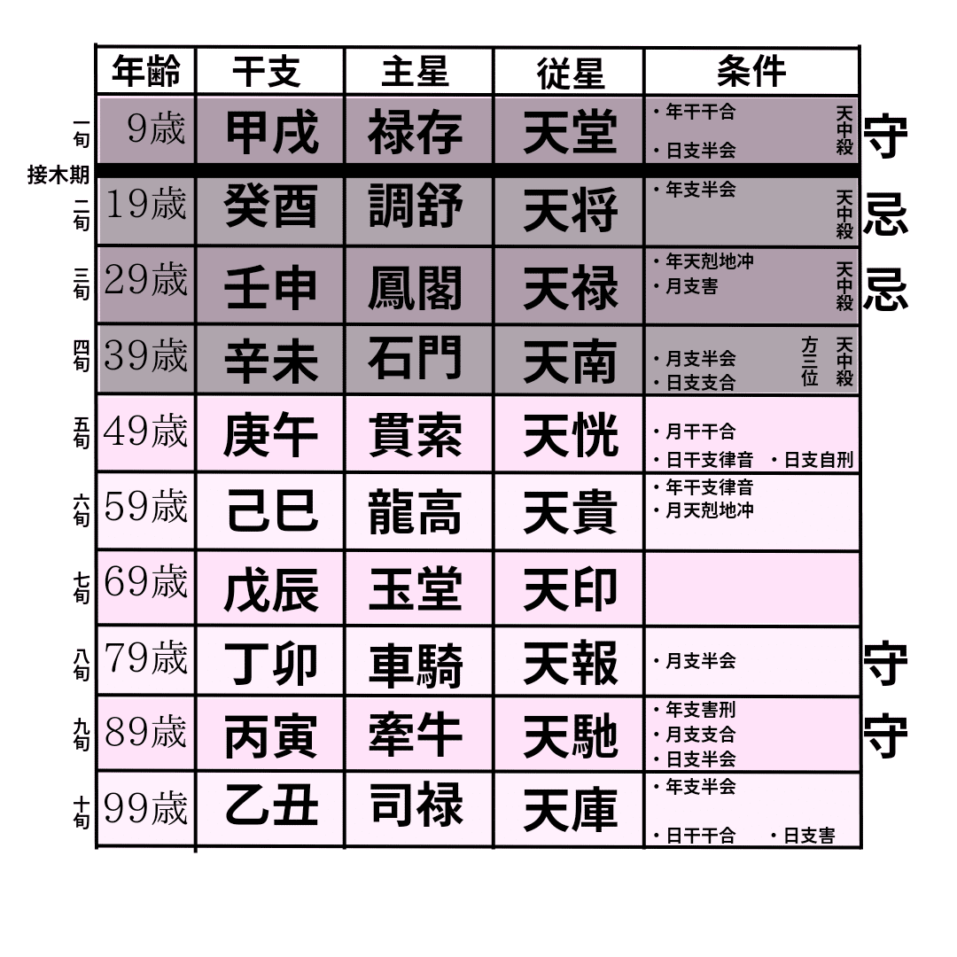 単純に考えても苦労を伴う二十年です。また主星の調舒星、鳳閣星は精神の星ですから精神的苦悩があったはずです。そこに天将星天禄星ですから現実界での苦労もあります。