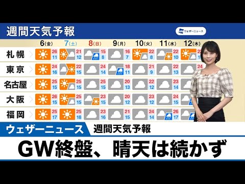 週間天気予報/GW終盤、晴天は続かず 2022年5月5日(木)配信三連休明けの6日(金)は前線上に低気圧が発生して本州の南海上を東進しますが、本州から離れて通過するため日本付近は広く晴れる予想です。ただし、太平洋側中心に湿った空気の影響を受ける可能性があります。気温は高めで、北日本にかけて夏日になるところが多くなる予想です。▼週間の天気に関する情報はこちらhttps://wea...youtu.be