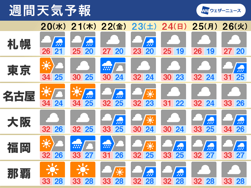 週間天気予報 曇りや雨の日が続く、新たな災害の発生にも警戒この先1週間の天気のポイントは「曇りや雨の日が多い」「新たな災害の発生に要警戒」「夏空はまだ先 梅雨のような蒸し暑さ」です。ウェザーニュースの最新の天気予報を随時確認してください。weathernews.jp