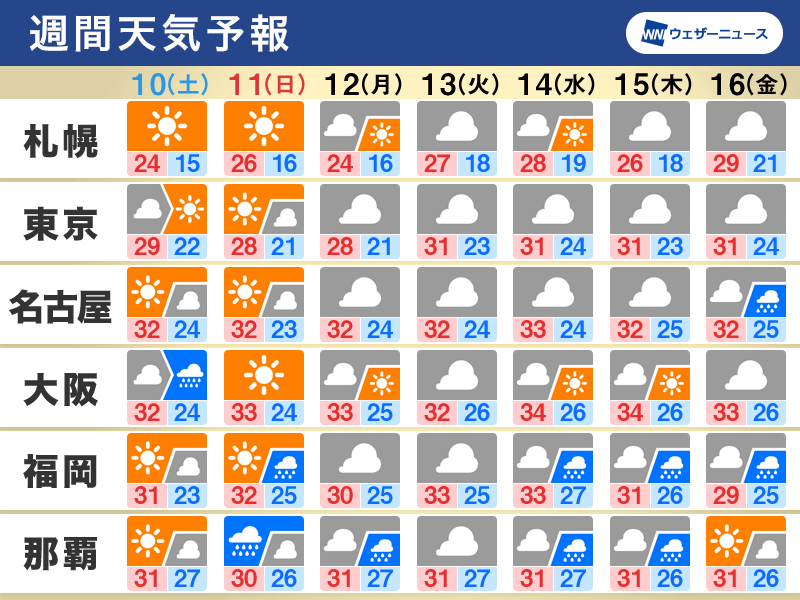 週間天気予報 週前半に台風12号が沖縄接近 彼岸前は残暑この先1週間の天気のポイントは「週末は晴れても不安定な空」「台風12号 動きが遅く長引く影響に注意」「お彼岸前は東日本も残暑厳しく」です。ウェザーニュースの最新の天気予報を随時確認してください。weathernews.jp