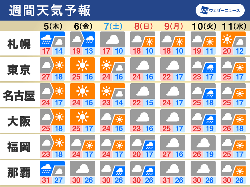 週間天気 朝晩涼しく秋の体感 北日本は低気圧が急発達し荒天警戒この先1週間の天気のポイントは「5日(木)から6日(金)は北日本で荒天警戒」「秋の気温へ 関東など長袖の準備を」「三連休後半は曇りや雨」です。ウェザーニュースの最新の天気予報を随時確認してください。weathernews.jp