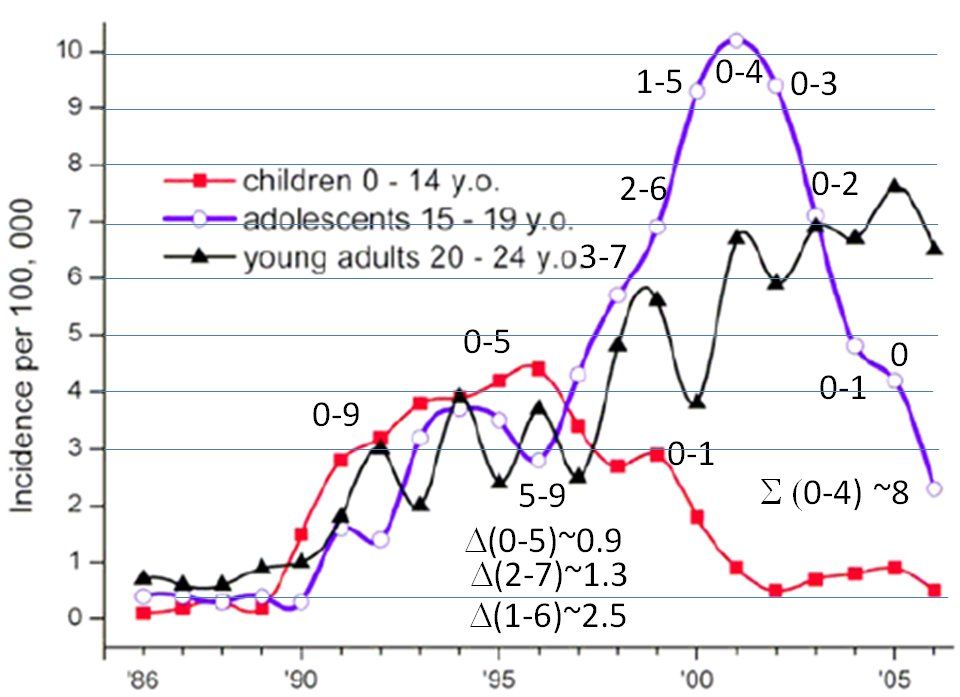ベラルーシでの甲状腺がん発症率の1997年以降の推移