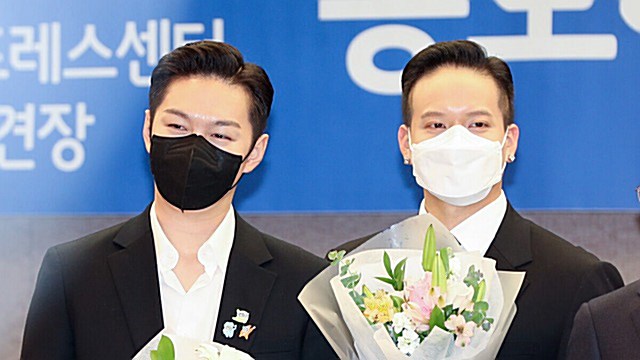 [E포토] 비투비 이창섭-프니엘, '꽃다발 들고 활짝'그룹 비투비의 이창섭(왼쪽)과 프니엘이 6일 오전 서울 중구 한국프레스센터에서 열린 '2022 보령해양머드박람회' 홍보대사 위촉식에서 기념촬영을 하고 있다.ent.sbs.co.kr
