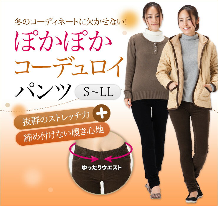 ぽかぽかコーデュロイスキニーパンツ★ストレッチが効いてウエストゴムの冬のあったかコーデュロイパ...