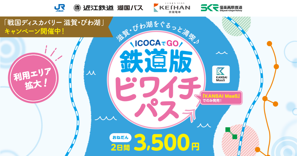 京都から琵琶湖線と湖西線で琵琶湖をぐるりと回るJRフリー(草津〜貴生川間 今回追加)と、近江鉄道全線フリー、京阪大津線フリー(今回追加)、信楽高原鐵道フリー(今回追加)、近江八幡エリアの近江バスフリー、長浜エリアの湖国バスフリー(今回追加)、八幡山ロープウェイ往復券、長浜おでかけパスポート がセット