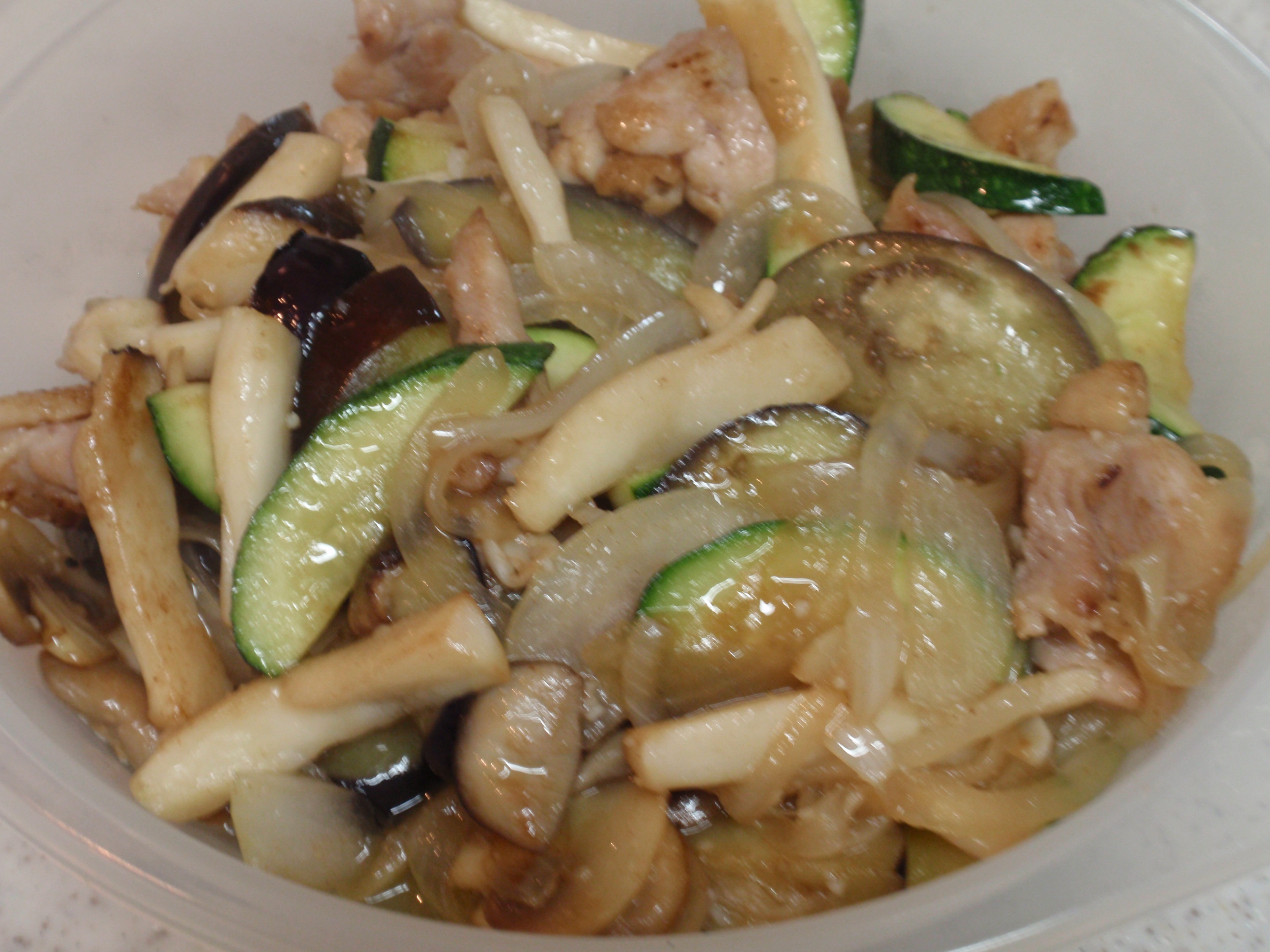 茄子、ズッキーニ、玉ねぎ、ホワイトマッシュルーム、シメジ、エリンギ、鶏肉。