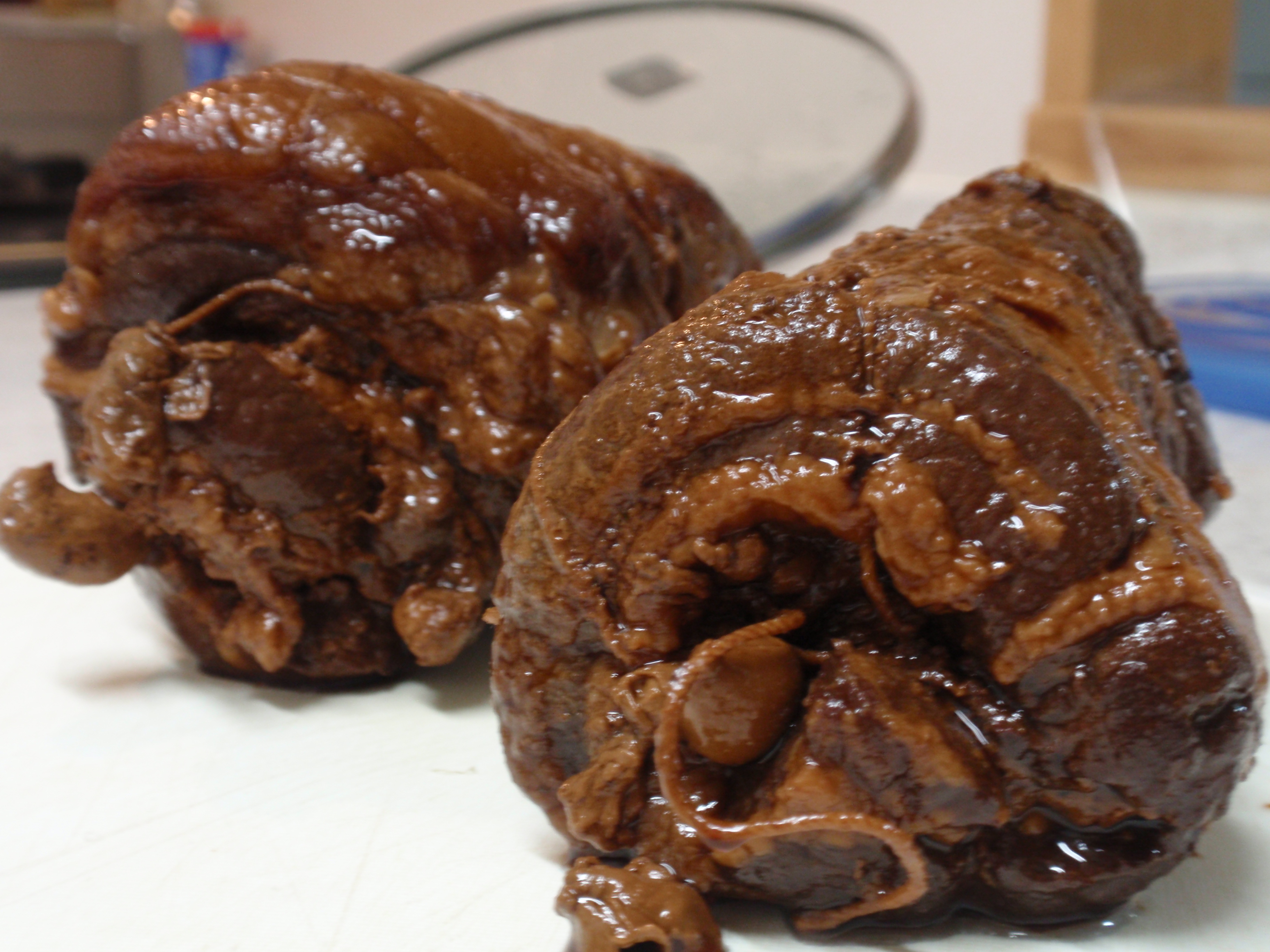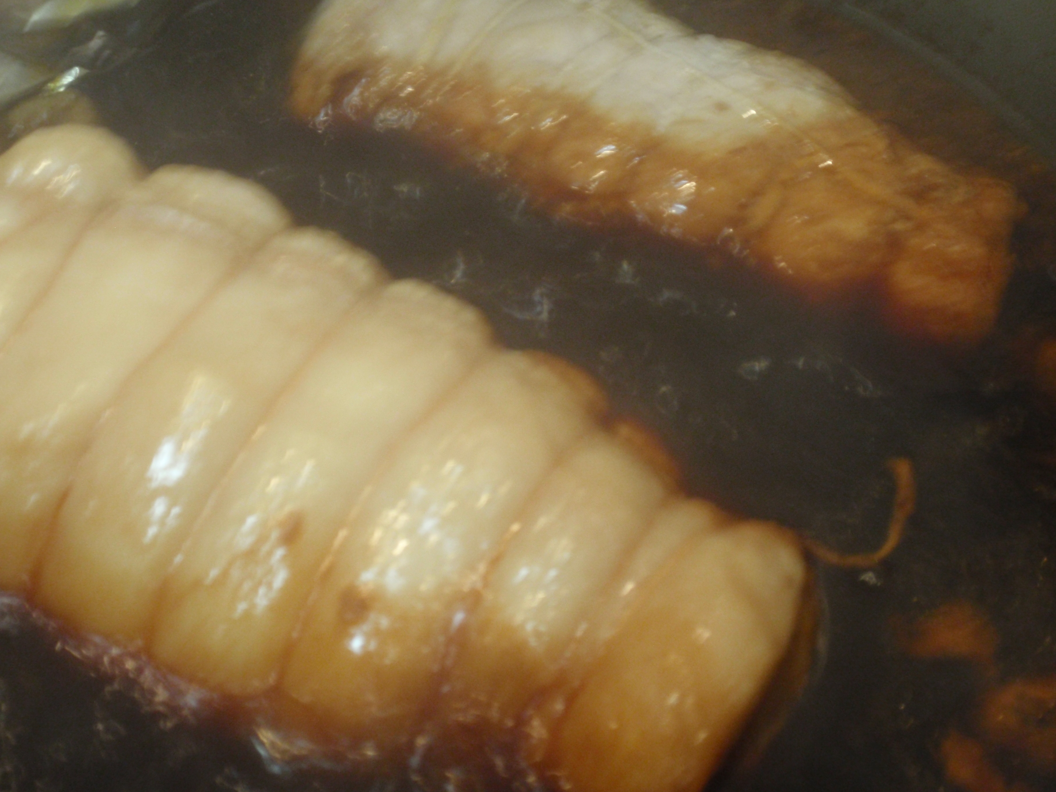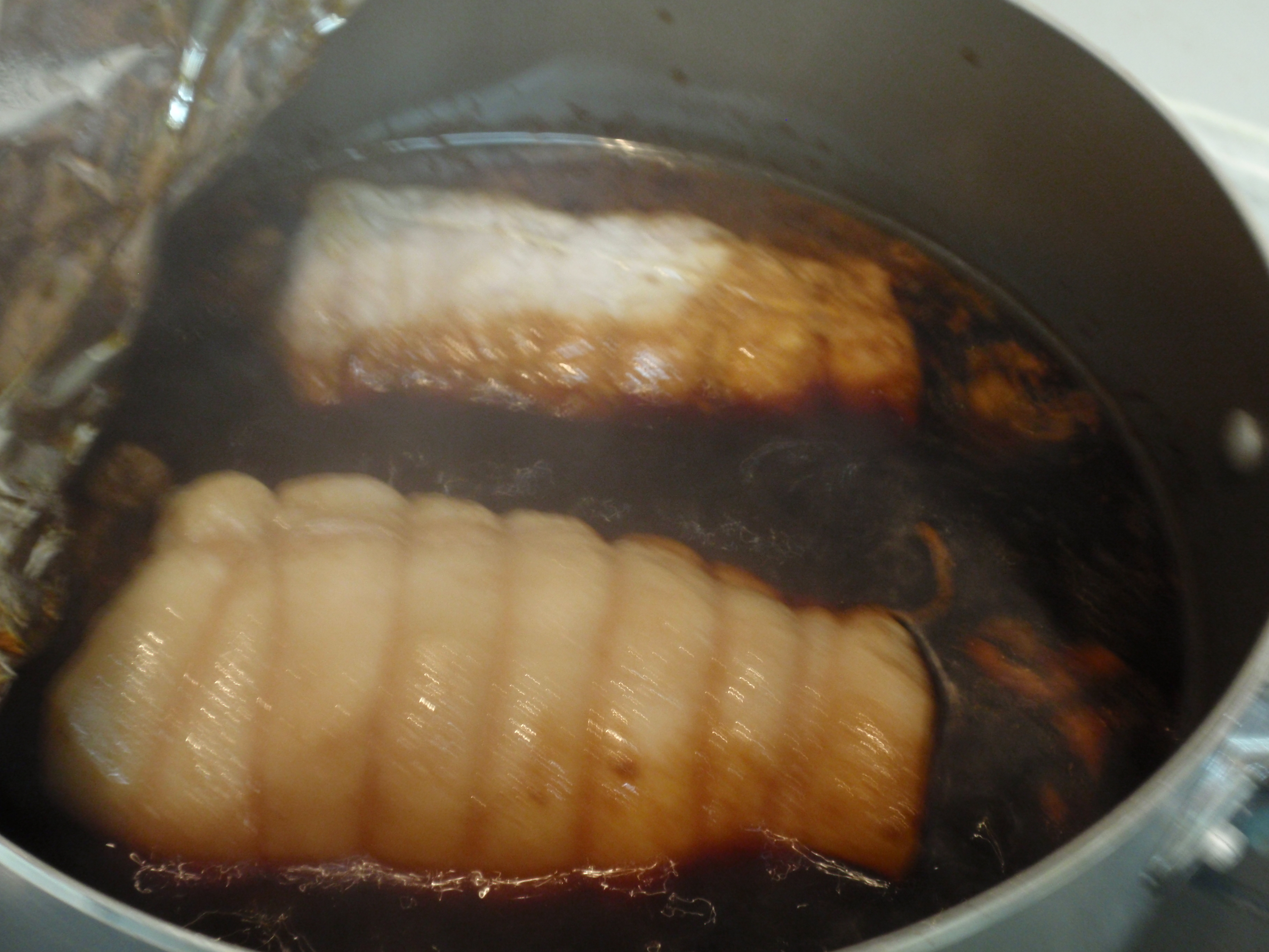 ずっと足し続けている醤油だれに漬け込んで弱火でコトコト。