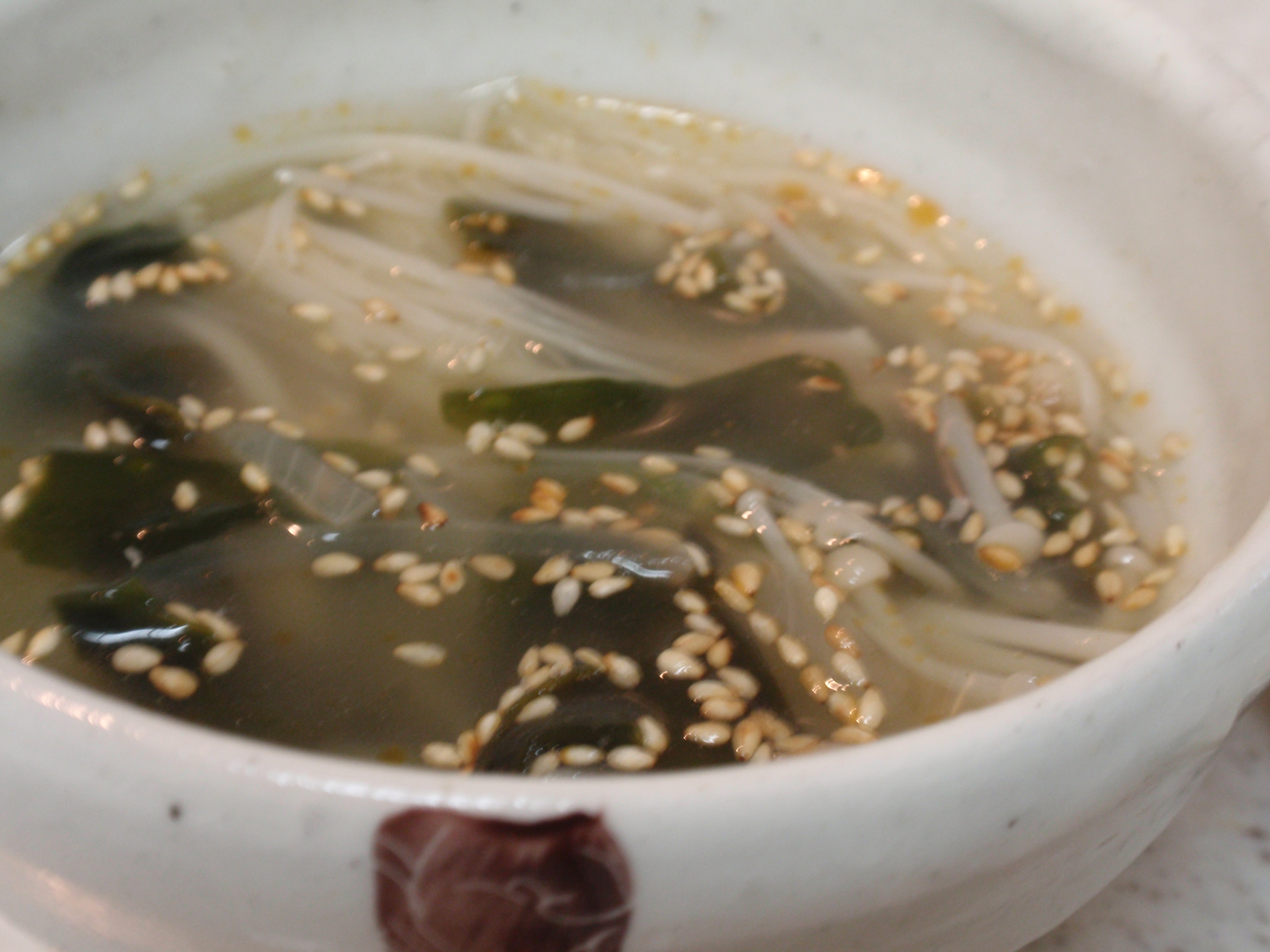 残り物の玉ねぎとエノキと乾燥ワカメで即席中華スープを添えて。