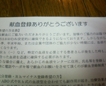 いやぁ、今日は献血なんぞしてみましたよ~。。会社に赤十字血液センターの方々がご丁寧に出向いてくれておりまして~。