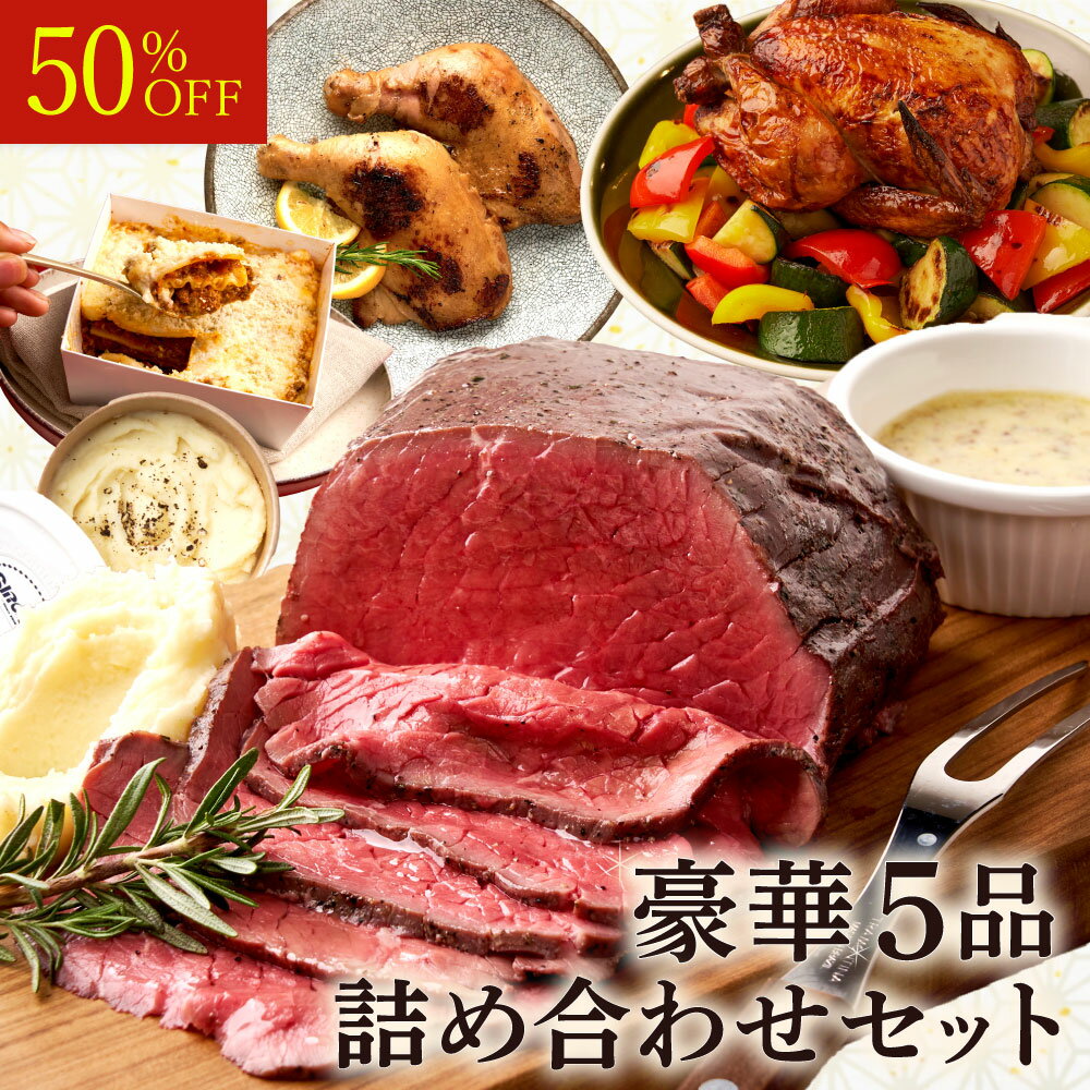\半額★50%OFF/豪華5品 詰め合わせ セット SALE セール 数量限定 限定販売 ローストビーフ 丸鶏 チキンレッグ ラザニア マッシュポテト ディナー 福袋 オードブル パーティーセット お取り寄せ グルメ お肉 バラエティ ご馳走 敬老の日 【在庫一掃セール】楽天市場${EVENT_LABEL_01_TEXT}