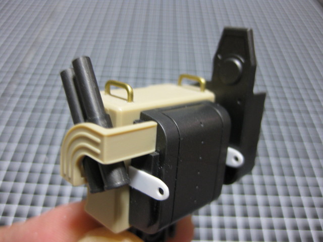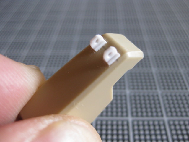 腰中央のブロックにアイプレートを付けました。これもHOBBYJAPAN誌の作例と同じ工作ですが、作り方は自己流で、まず0.5mmプラ板を切り出して作ったアイプレートを接着、それだけでは強度が出ないので台座部分で左右から挟むようにして接着固定してあります。