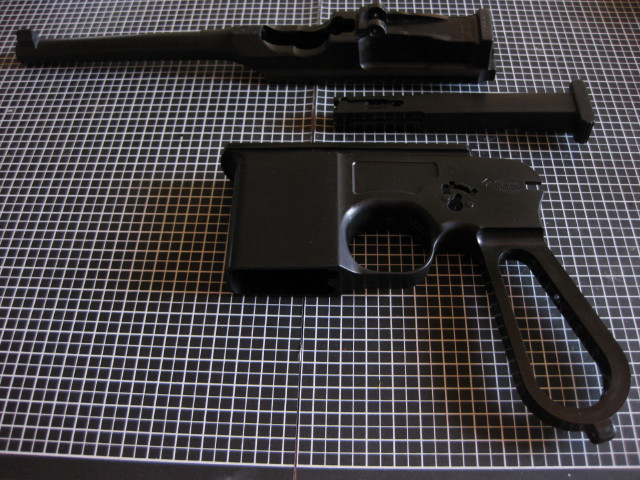 まずフレーム、レシーバーなどの樹脂パーツの整形を行います。モデルガンやエアガンは強度が必要であるためスチロール樹脂ではなく、ほとんどがABS樹脂で出来ています。